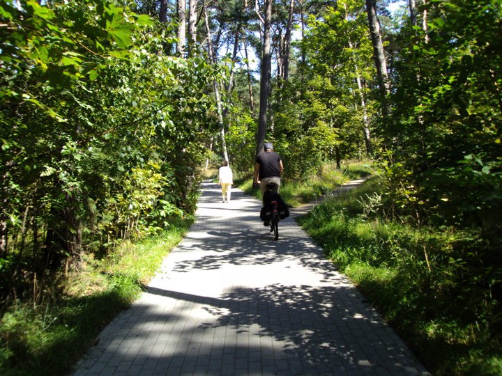 Dar vienas puikus būdas ilgiau pabūti šiame krašte – keliauti dviračiais. Išbandyti keli variantai. Labai patiko važiuoti vadinamąjį ratą aplink Kuršių marias. Automobilį palikę Klaipėdoje darėme trijų dienų ir dviejų nakvynių žygį dviračiais. Iš Klaipėdos pradėjome keliauti žemynine dalimi pro Klaipėdos uosto teritoriją link Ventės rago. Kelias gana įvairus, vedė palei Vilhelmo kanalą, miškinga ir smėlinga trasa, vėliau didžioji kelio dalis buvo žvyruota, taip pat teko pavažiuoti ir plentu. Tokiu būdu labai smagiai galima apžiūrėti ir pravažiuoti Kliošų kraštovazdžio draustinį, tada sustoti Priekulėje – ten vietinėje parduotuvėje nusipirkome bandelių ir užkandome, buvo visai smagu, tada prasukome pro Dreverną, kur galima užlipti į apžvalgos bokštą, prasukti pro buriuotojų rojų Svencelę, Svencelės telmologinį draustinį.